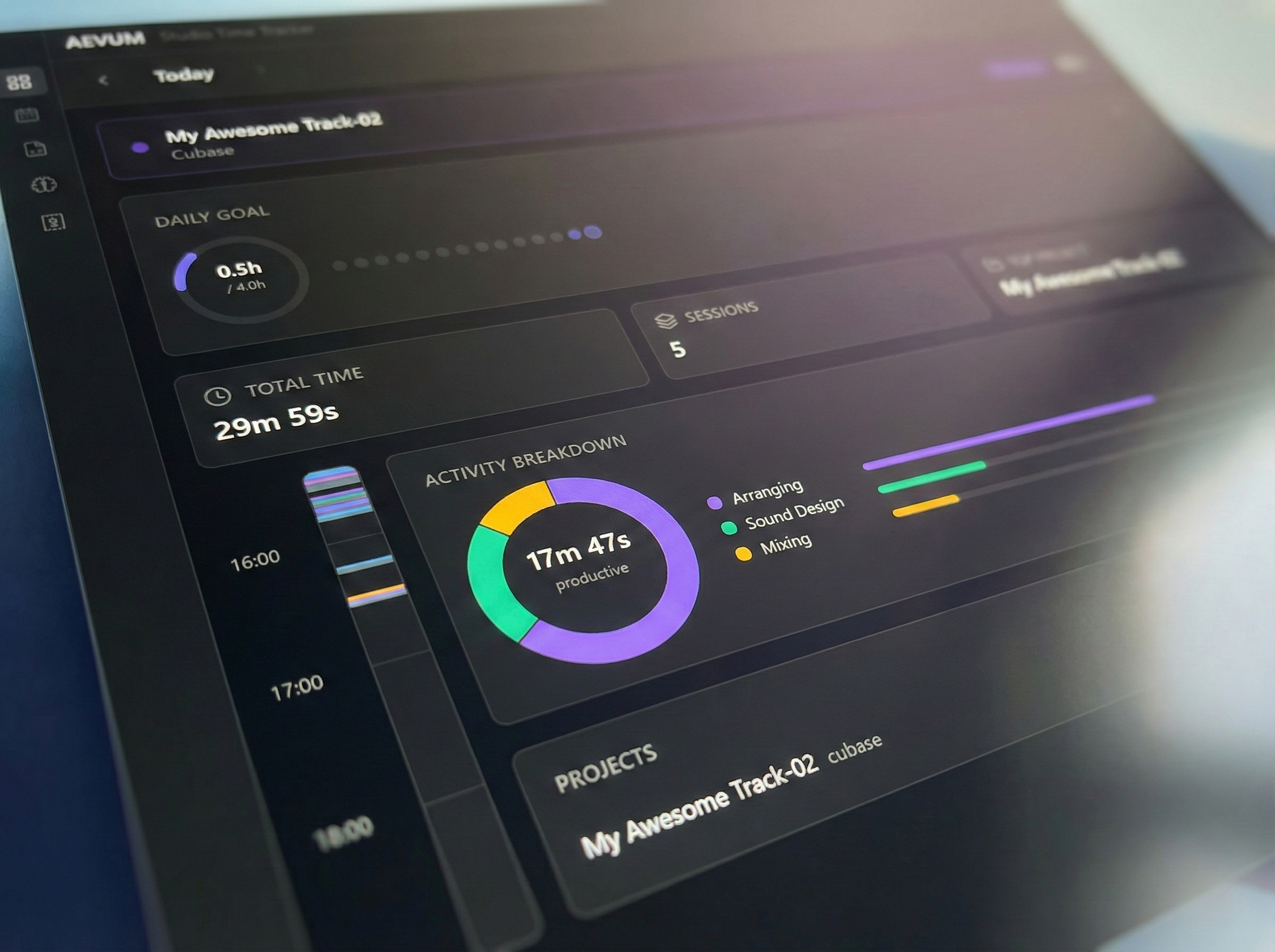 See where your time goes: composing, mixing, mastering, sound design. Every session categorized.